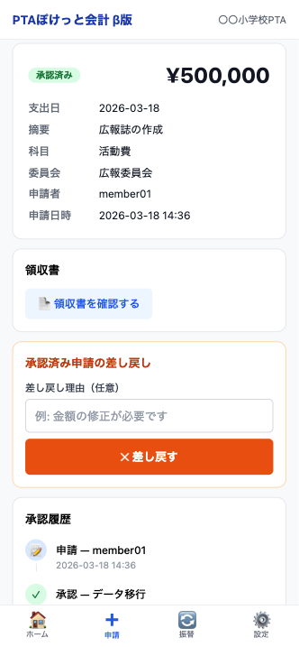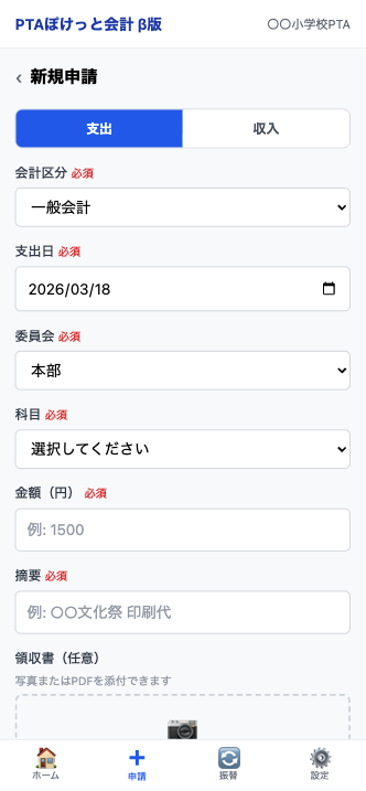 委員会担当者がその場でスマホから申請。領収書の写真もそのまま添付できます。紙の申請書を集める手間がなくなります。