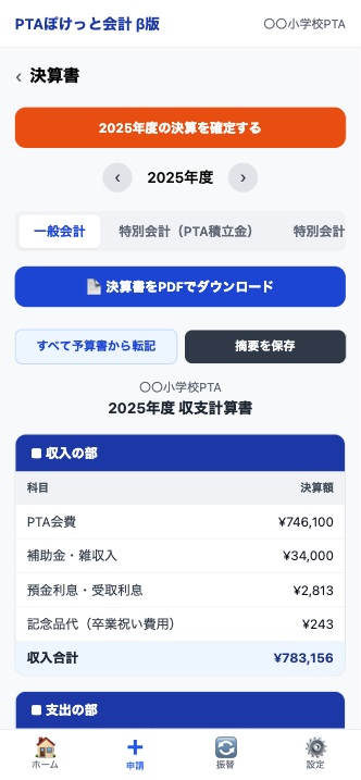 収支計算書・予算対比表をPDFで自動生成。Excelで一から作る手間がなくなります。